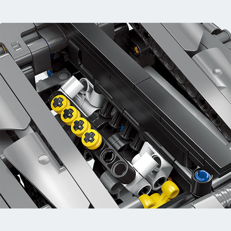 Built with 1391 precision-engineered pieces, this 1:14 scale supercar replica combines sleek design with high-performance functionality — including a remote-controlled drive and steering system, and a working engine with rotating pistons.