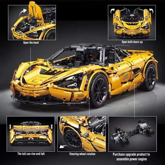 Once complete, the Yellow 720s stands as a stunning display of power and precision, featuring opening doors, hood, and rear end, alongside a fully developed interior and functioning steering. Enhanced with LED lighting, high-torque motors, and a rechargeable battery pack, this model combines mechanical complexity with visual excellence.